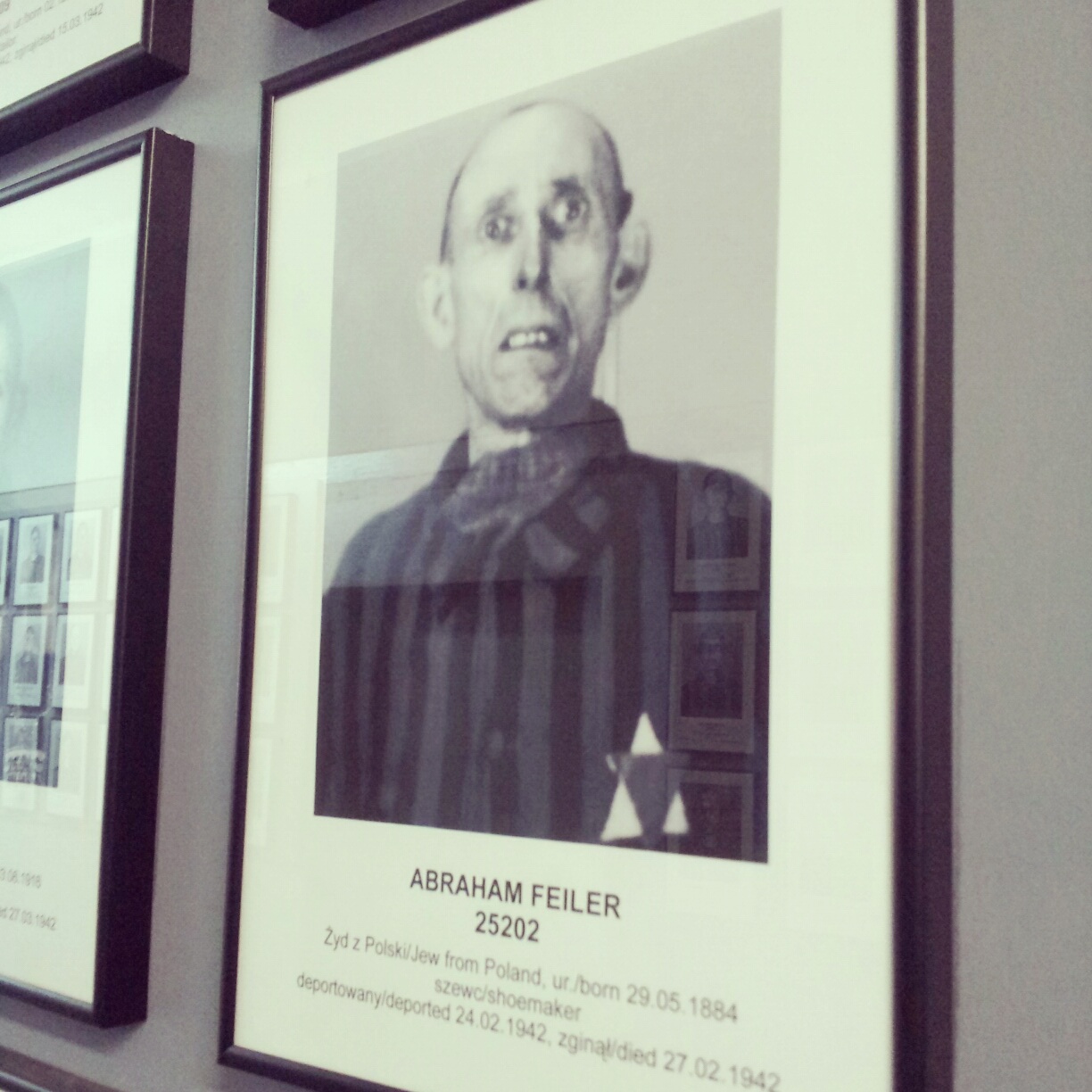 IMG_20130211_150352Abraham Feller guckt mit einem Ausdruck, als ob er wenige Sekunden später seine letzen Atemzüge nimmt. Die Augen des polnischen Juden und Schuhmachers, der lediglich drei Tage im Lager überlebte, sind weit geöffnet, wirken krank und glasig. Keine Zuversicht, kein Glaube, kein Optimismus – das personifizierte Auschwitz. Der Nächste, Aron Löwi, Jude, Kaufmann, hat ein ordentliches Veilchen unter seinem linken Auge, wirkt abgemagert und misshandelt. Lebenszeit: fünf Tage.