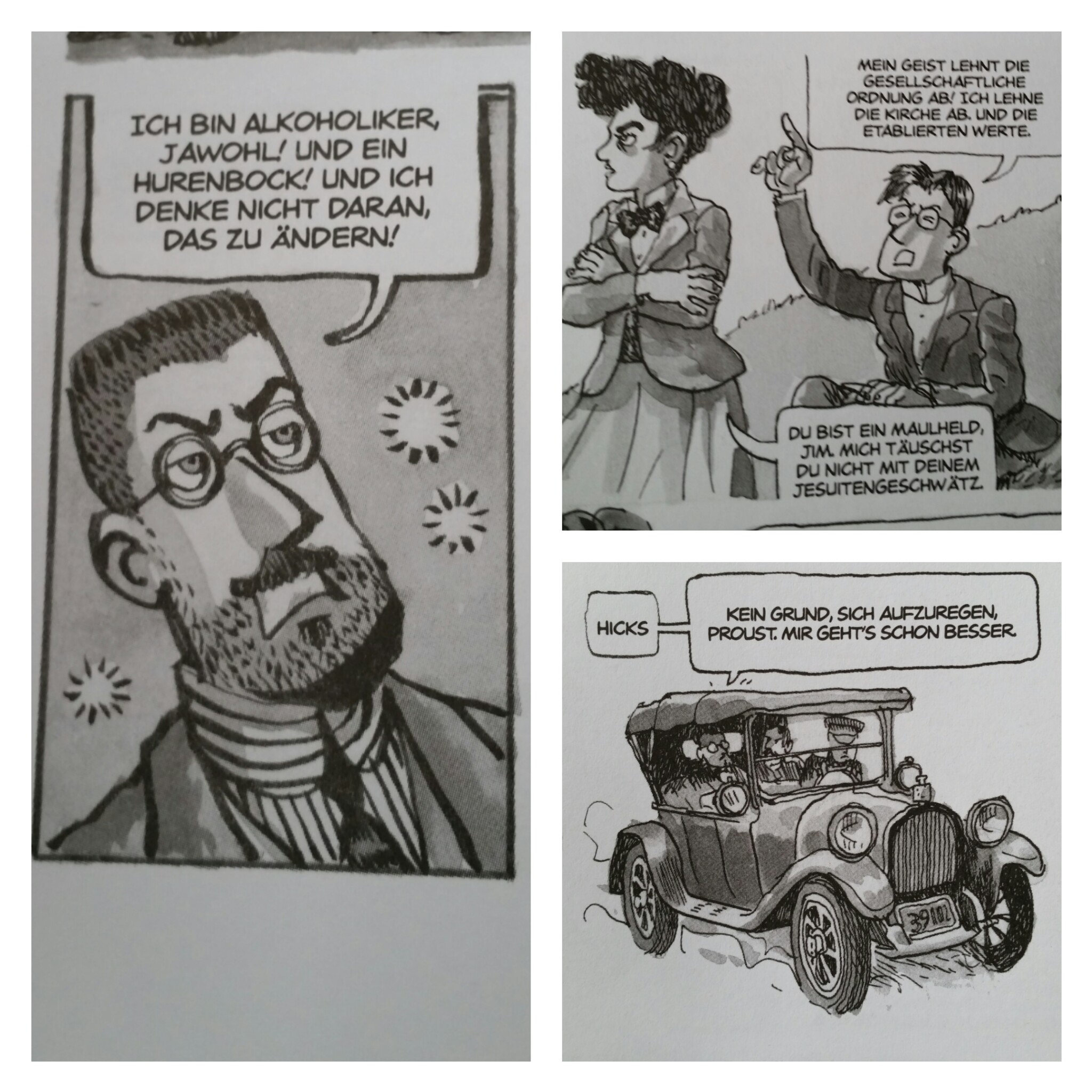 Alfonso Zapico thematisiert in seinen schwarz-weiß Panels kaum Joyces literarisches Schaffen, sondern widmet sich seinem feucht-fröhlichen Lifestyle zwischen Abstürzen und dem Wunsch, endlich erfolgreich zu sein. Zwischen am Hungertuch nagen und die Sau raus lassen. Immer wieder kommt es dabei zu Kuriositäten: Bei einer Heimfahrt reihert er zum Beispiel fast Marcel Prousts Taxi voll. Der politische Joyce, der Irland den Rücken kehrte, hatte sich stets für die Politik seiner Heimat interessiert und bewegte sich insgesamt stets zwischen den Extremen – das fällt in dieser Arbeit besonders auf.