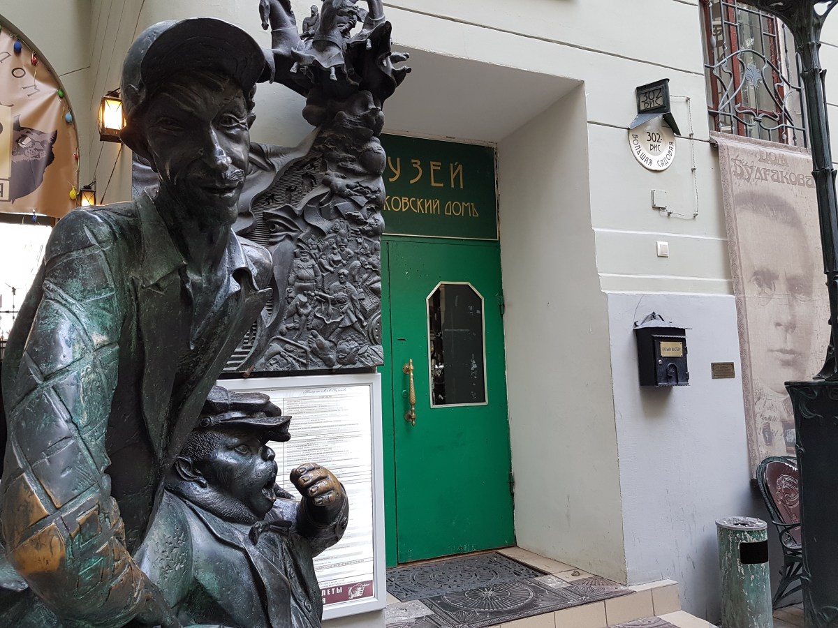 Bulgakow-Haus Moskau 7 Published at 4032 × 3024 in Quer durch Moskau « zurück weiter » Eingang zum Museum, in dem der Eintritt kostenlos ist. Im Vordergrund stehen zwei Skulpturen. Sie sollen die Gehilfen Volands, Korowjew und Behemoth, darstellen.